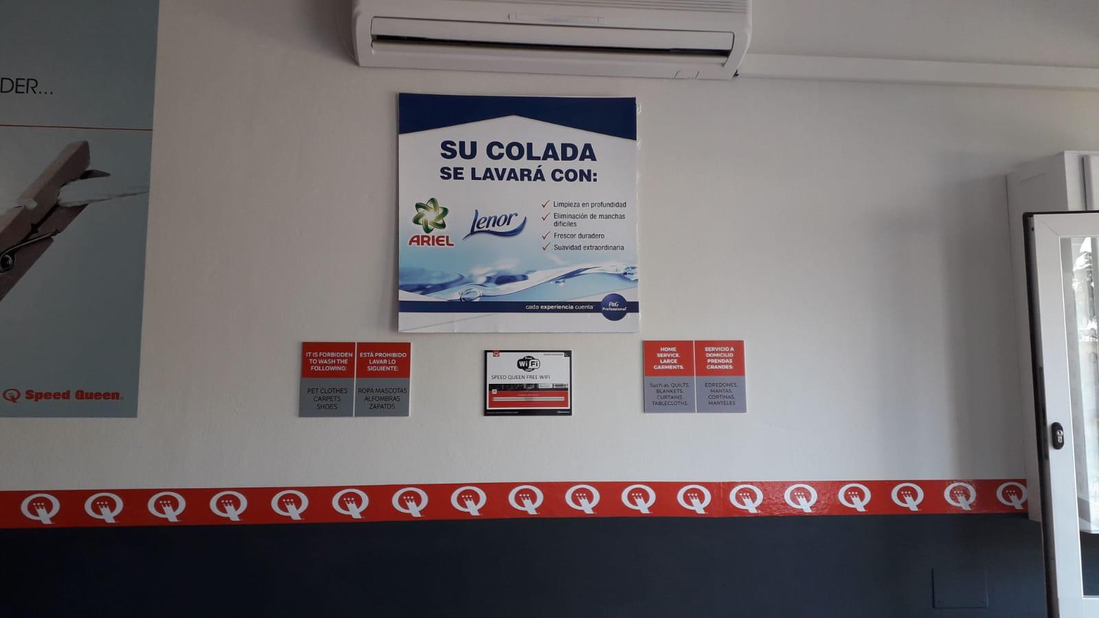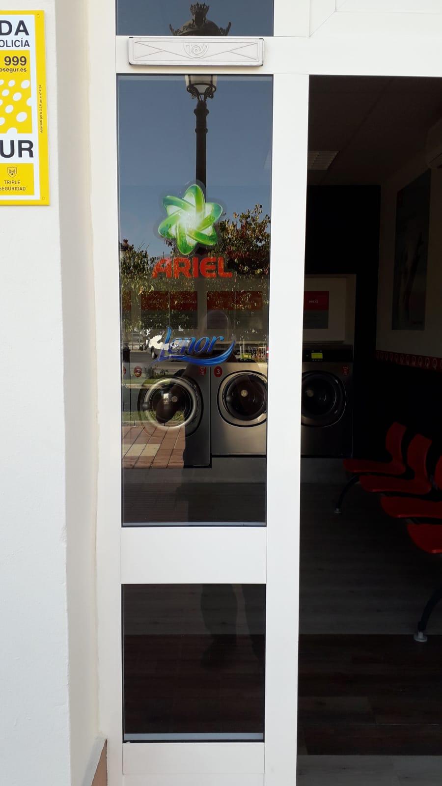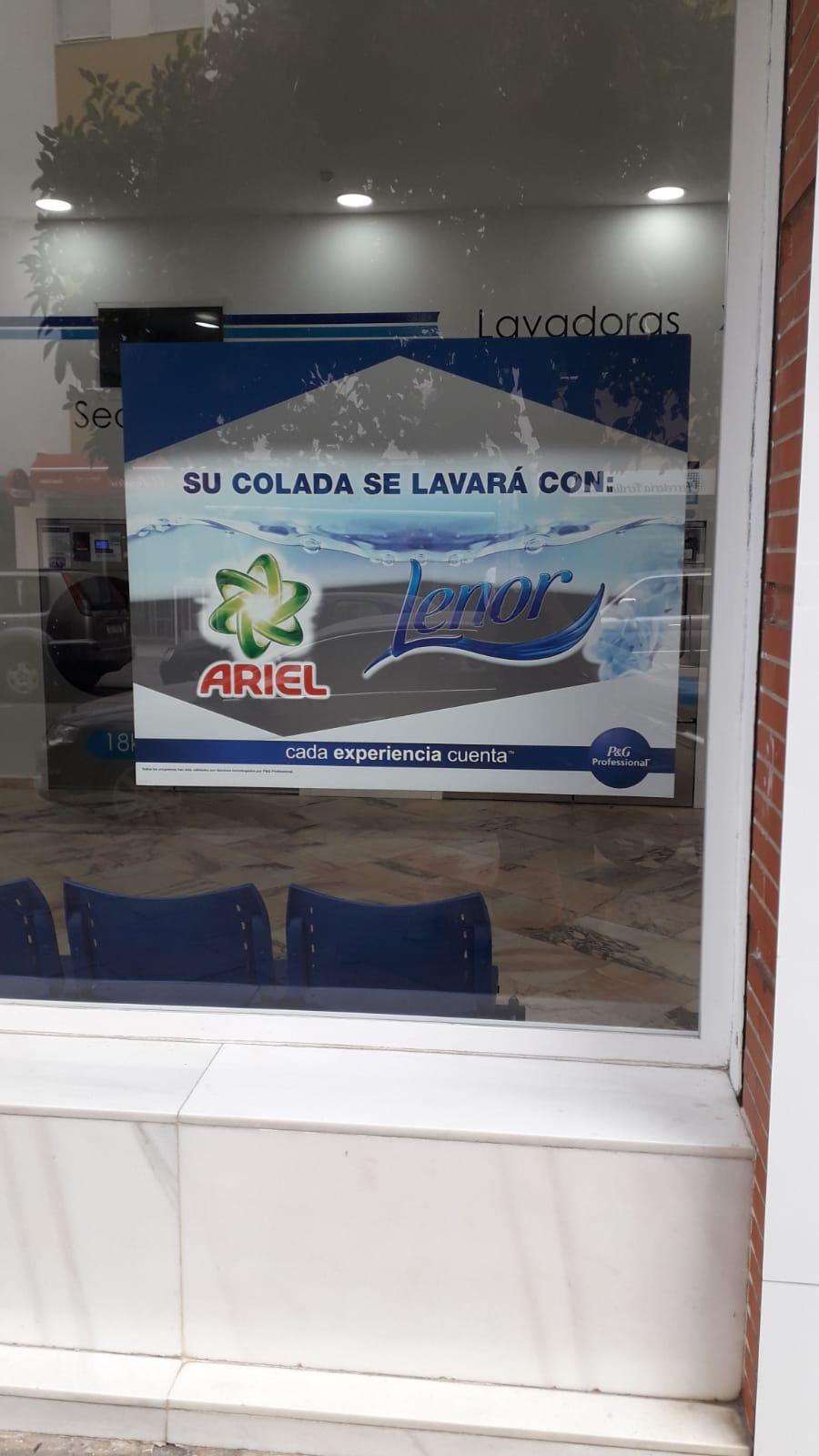 Otro punto de diferenciación con tu competencia es aprovechar al máximo el reconocimiento de las marcas para atraer clientes a tu lavandería, para ello te enviaremos unos vinilos decorativos que puedes colocar dentro y fuera de tu local en los que se informa a tus clientes que su colada será lavada con Ariel y Lenor. Te mostramos a continuación alguna foto reales de nuestros clientes: