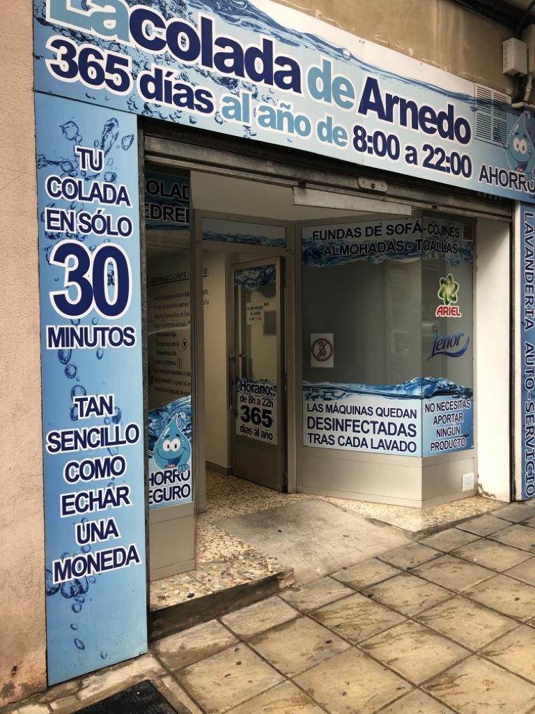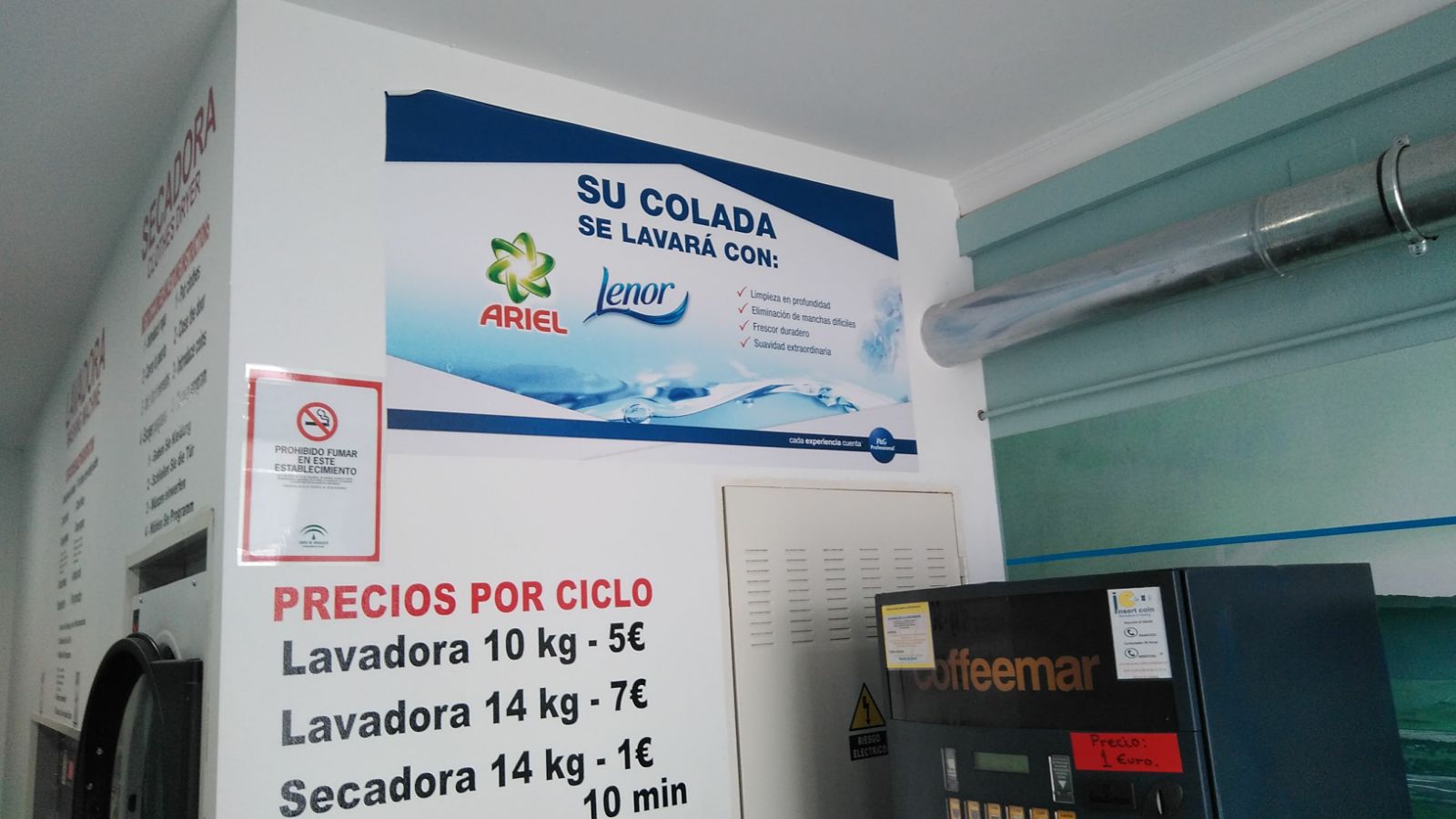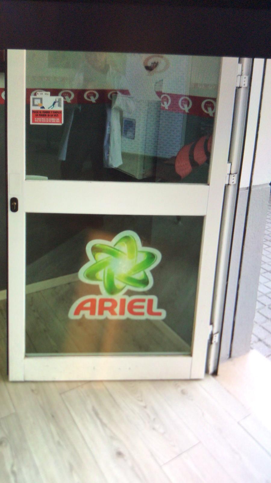Otro punto de diferenciación con tu competencia es aprovechar al máximo el reconocimiento de las marcas para atraer clientes a tu lavandería, para ello te enviaremos unos vinilos decorativos que puedes colocar dentro y fuera de tu local en los que se informa a tus clientes que su colada será lavada con Ariel y Lenor. Te mostramos a continuación alguna foto reales de nuestros clientes: