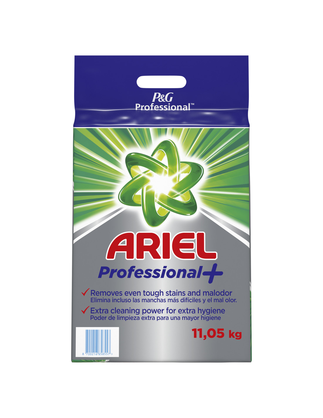 El detergente para lavadora en polvo de Ariel Profesional de 11,05 kg es un detergente condensado que mejora la fórmula anterior y que proporciona una blancura y limpieza excelente además de eliminar las manchas. Su combinación de ingredientes de alto rendimiento y sus tensioactivos son capaces de eliminar las manchas más complicadas. Sus enzimas de alta tecnología ( tecnología Actilift) previenen la creación de manchas. El detergente Ariel Profesional se puede utilizar tanto en ropa blanca como de color, dejando un suave aroma a la colada.