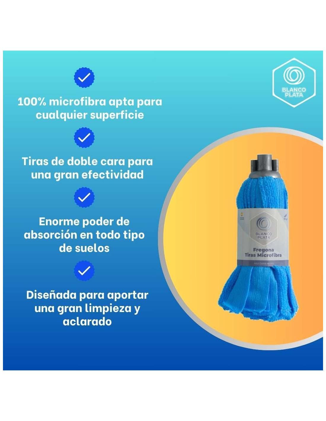 La fregona de tiras de microfibra azul doble acción de Blancoplata tiene un gran poder de absorción y gran durabilidad. Sus tiras de microfibra tiene una doble acción, por un lado tiene un gran poder de limpieza arrastrando cualquier tipo de suciedad y por otro gran poder de secado. Sus tiras son muy resistentes al desgaste. Compatible con la ERGO FREGONA