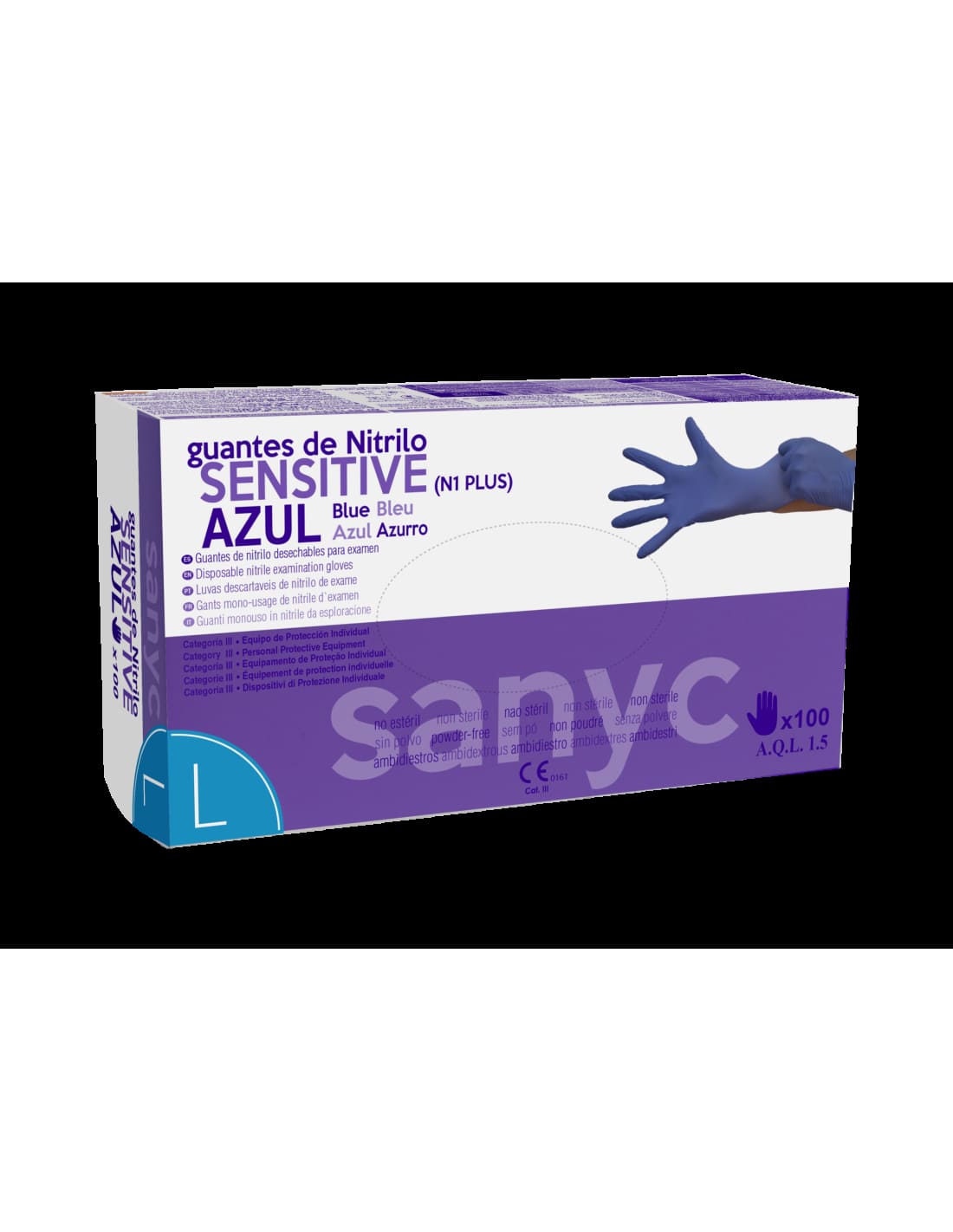 GUANTE NITRILO AZUL SIN POLVO SANYC SENSITIVE SIN POLVO TALLA EXTRA PEQUEÑA 100 UNIDADES